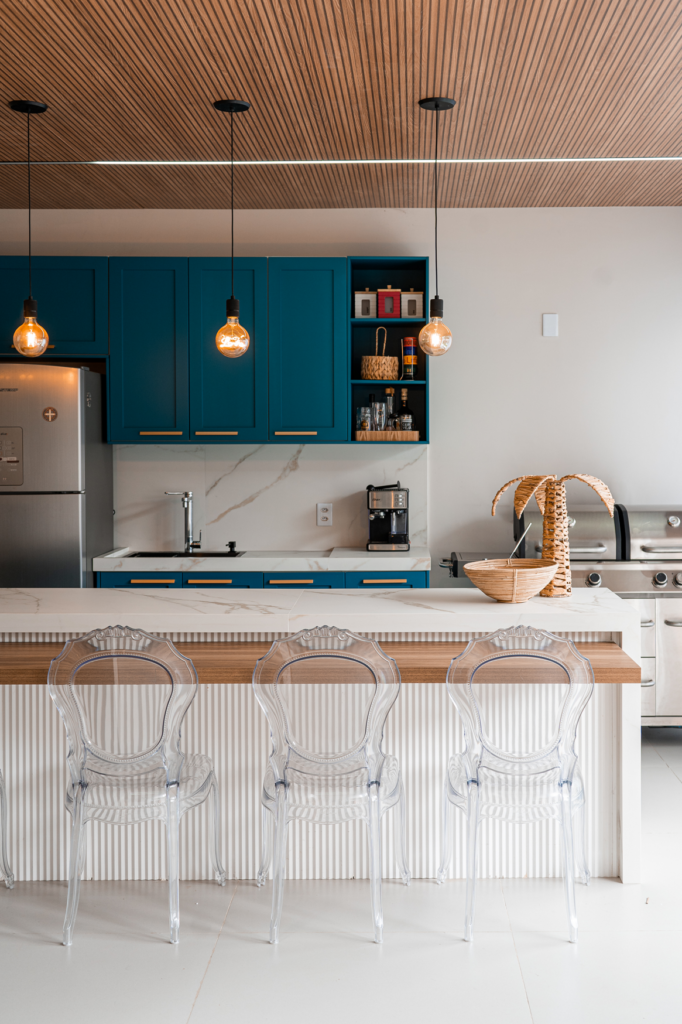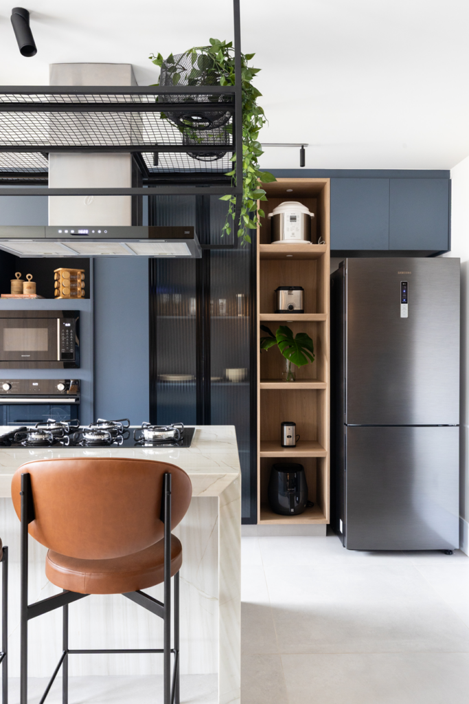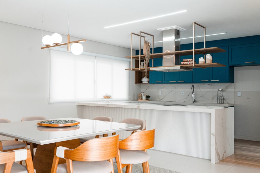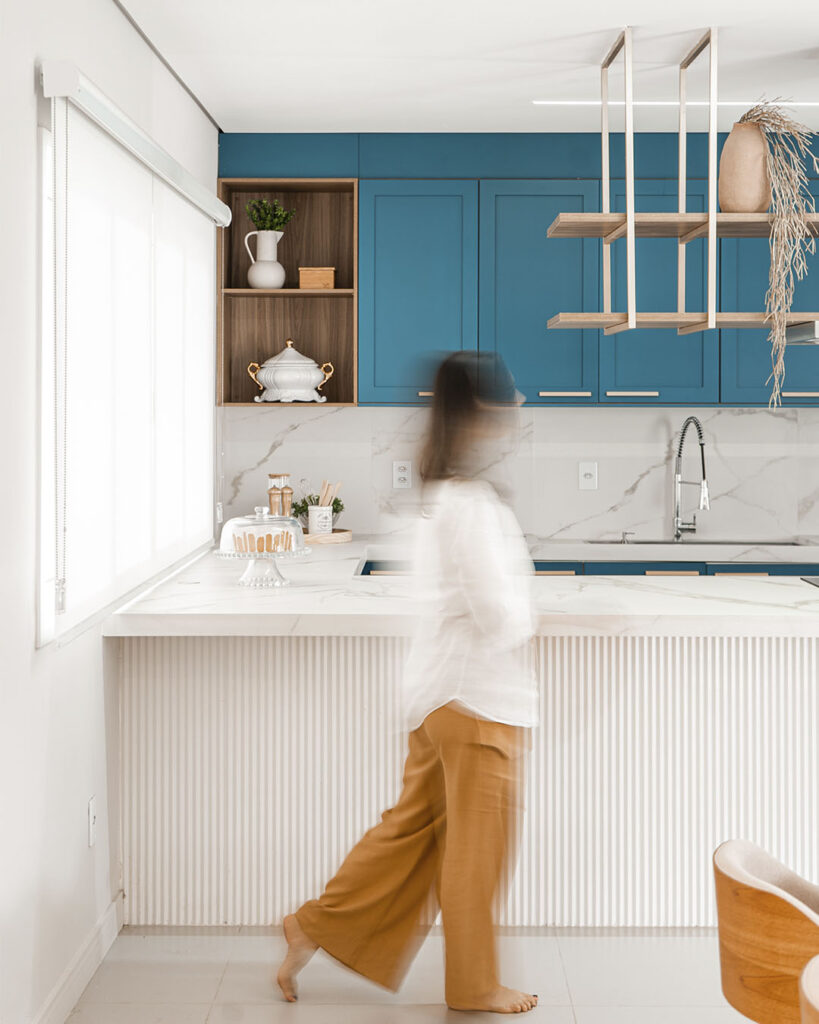 Em cozinhas planejadas, onde cada detalhe é pensado para o bem-estar, o azul ajuda a criar um espaço onde é bom estar, seja para preparar um café tranquilo ou reunir amigos em torno da mesa.