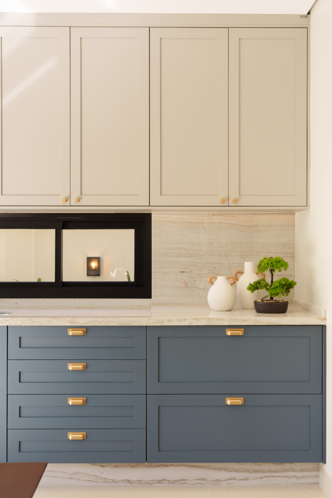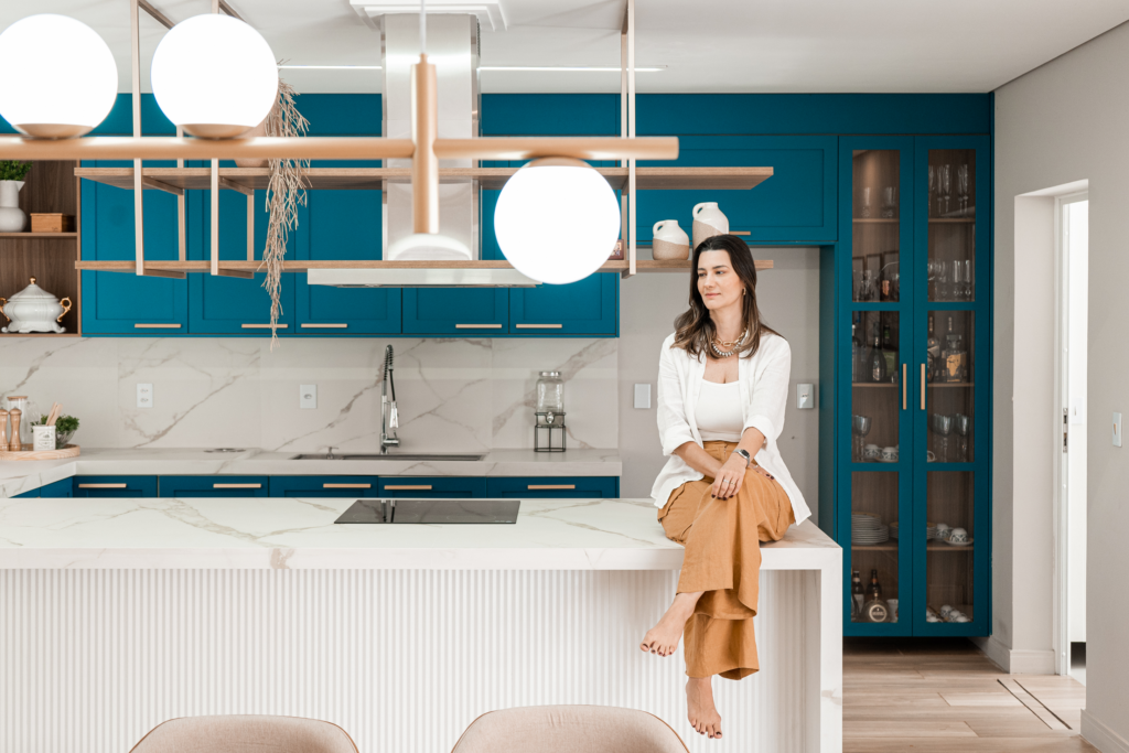 Nos móveis planejados, o azul cria um contraste perfeito com bancadas neutras, metais dourados ou detalhes em madeira, uma combinação que exala charme e equilíbrio.