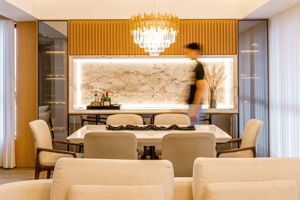 A escolha dos acabamentos faz toda a diferença. Tons amadeirados trazem calor ao ambiente. Texturas suaves deixam o espaço mais convidativo. Iluminação embutida em nichos ou painéis cria aquela atmosfera gostosa no fim do dia.