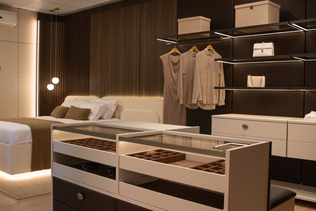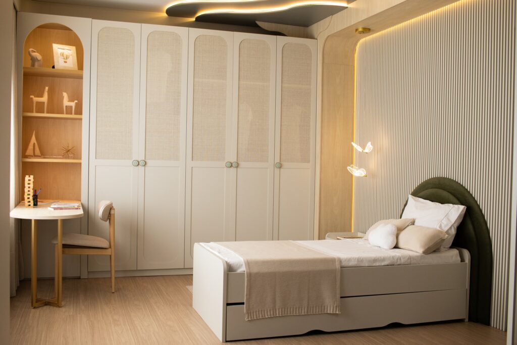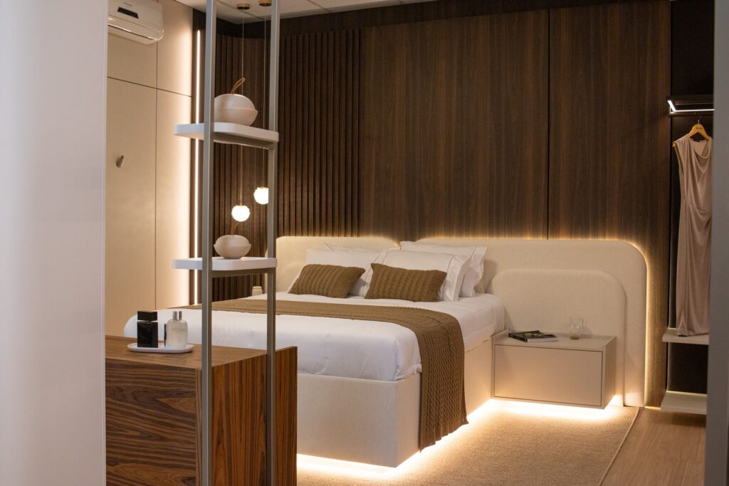 Entre os destaques do espaço estão a Porta Dominus Deslizante em tecido, que alia tecnologia e sofisticação, e a Cabeceira Arco, pensada para trazer aconchego e identidade ao dormitório. São detalhes que fazem diferença no projeto final e mostram como design e funcionalidade podem caminhar juntos.